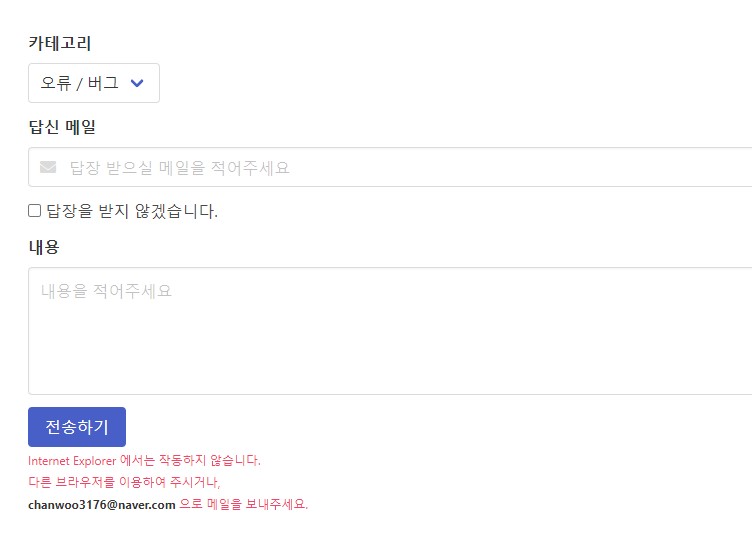 그래서 하나, 둘 개선해 나갔는데, 문제는 이 문제점들은 개발자인 내 관점에서 본 불편함이었고, 난 실제 유저들이 어디서 불편함을 겪는지 궁금했다. 그래서 문의 메일을 따로 적어 놨었는데, 생각보다 메일이 많이 오지는 않았다. 아무래도 업무용 사이트이다 보니, 다들 따로 메일을 적을 만큼 시간이 남지는 않을 듯 하여 사이트 내에서 메일을 보내는 기능을 넣어 보기로 했다.